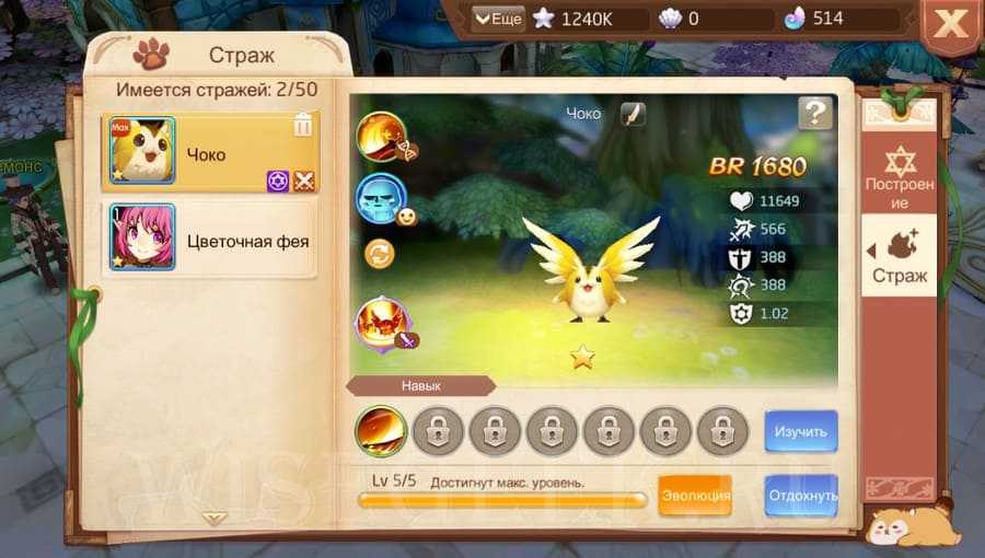 Повышения уровня. Следует давать стражам Летний сок или брать их с собой на битвы, чтобы получить опыт стражей. Когда страж переходит на новый уровень, его характеристики повышаются.