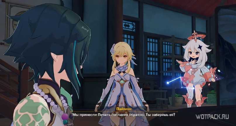 Поговорите с женщиной. Верр поведает вам о таинственном человеке в маске, который уже ушел, но оставил путешественнику послание. Этим посланием является Печать Согласия, которую нужно вернуть Сяо.