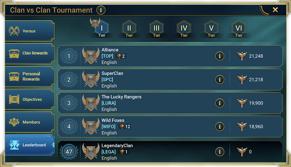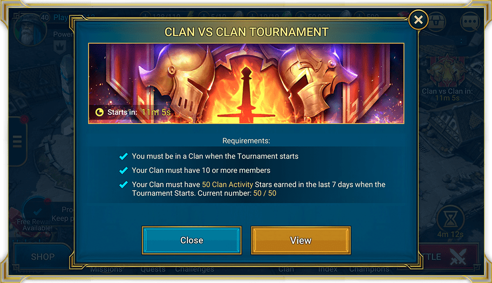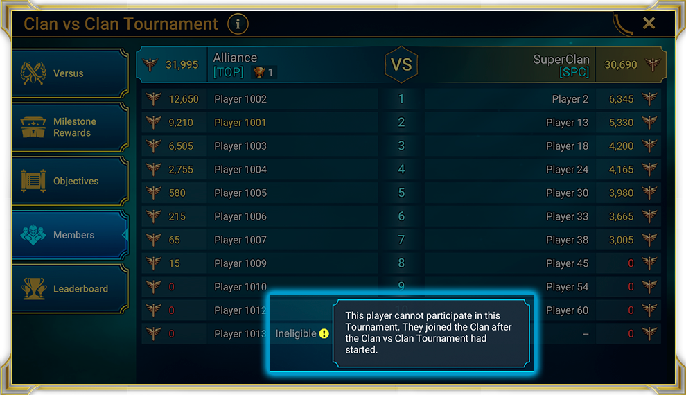 - Игроки должны быть полноценными участниками клана на момент начала турнира. Любой игрок, который вступит в клан после начала турнира, не сможет поучаствовать в текущем турнире.