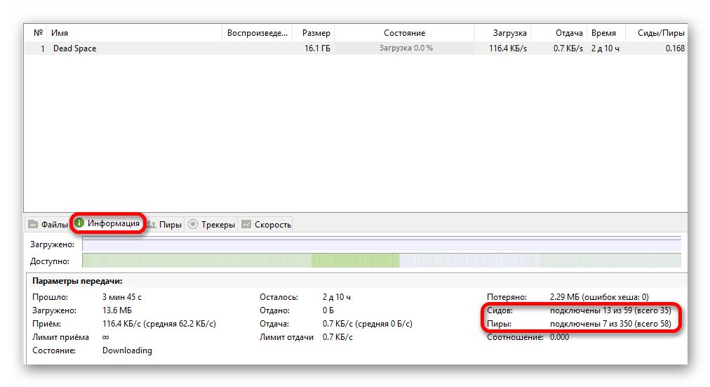Чтобы увидеть точное число сидов и пиров, перейдите во вкладку «Информация».