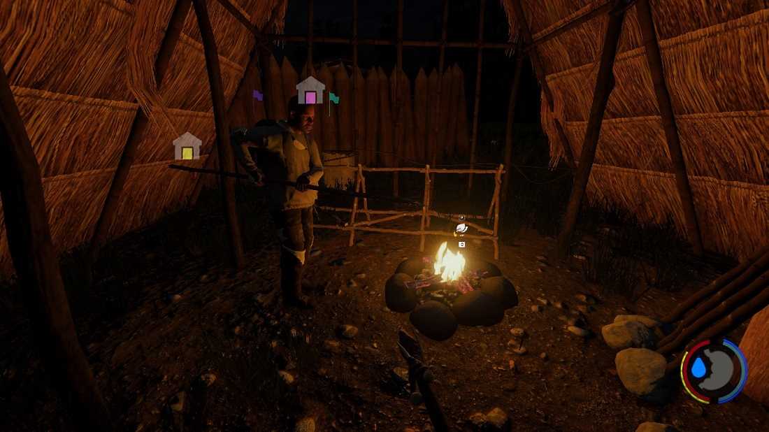 Ах да. Разжигая костёр, не забывайте про продукты, которые вы готовите. С горелого мяса вас может жёстко пронять на питье. Обычно лагерь ставится рядом с прудом, из которого можно пить. От водички вас вырвет или пропоносит, и вы снова захотите жрать. Не передерживайте и части тел людей и каннибалов. От них останутся только кости.