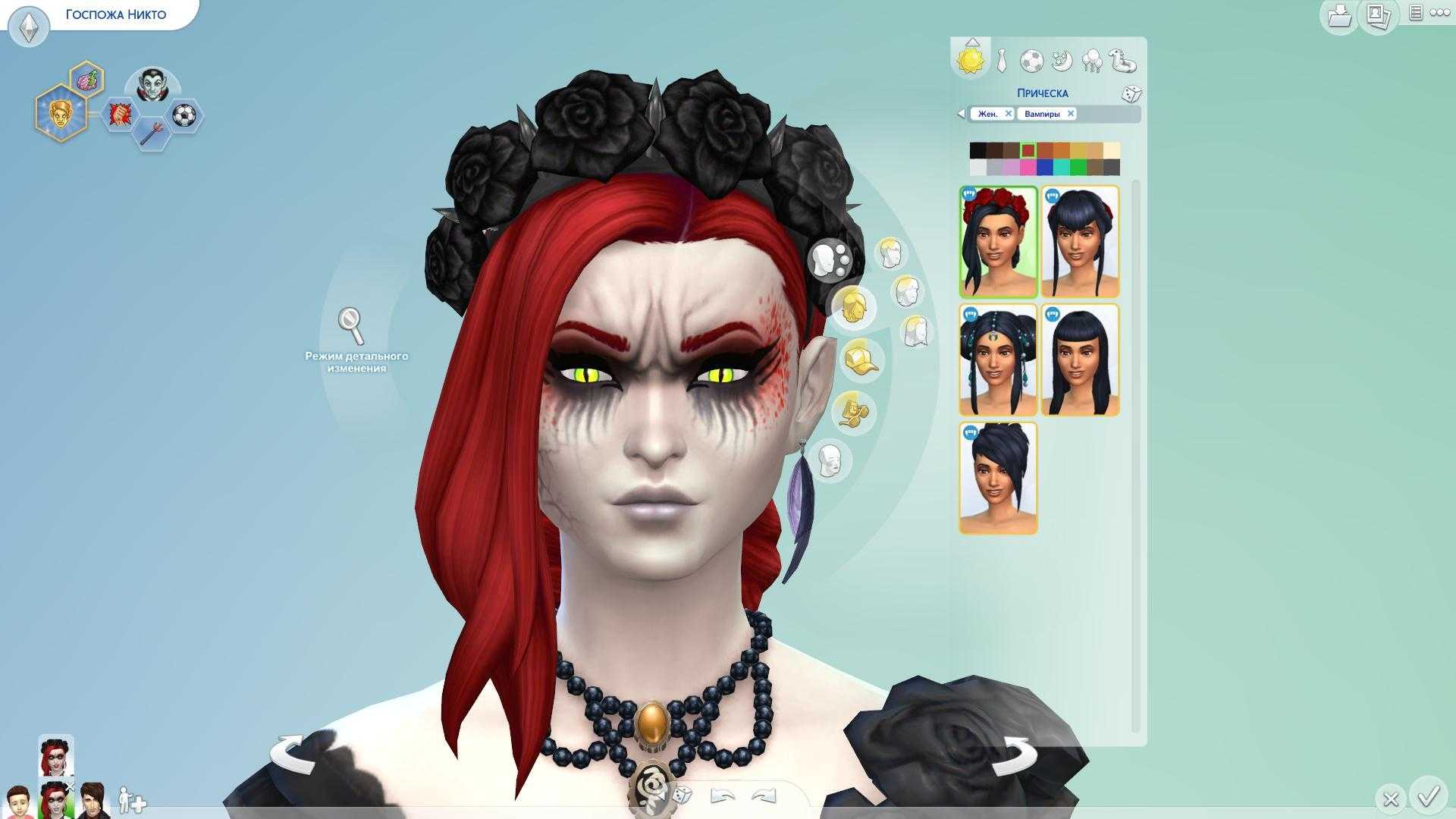 Отличия вампиров от простых смертных начинаются с внешности. В редакторе персонажей у простых смертных во вкладке «Лицо» всего три категории: тип лица и цвет кожи, особенности кожи и зубы (последняя вкладка относится к базовой игре, но появилась вместе с вампирским игровым набором). У вампиров категорий намного больше. Еще есть архетипы вампиров, брови вампира, глазницы вампира, особенности глаз, щеки вампира, рот вампира, несколько вариантов зубов с клыками, а также целый ряд дополнительных расцветок для глаз одна другой страшнее. Благодаря всей этой «красоте» вампира можно превратить в настоящего монстра: сделать ему впалые глаза, складки кожи на щеках и лбу, кучу клыков, вены, проступившие на лице и, конечно же, безумные светящиеся глаза.