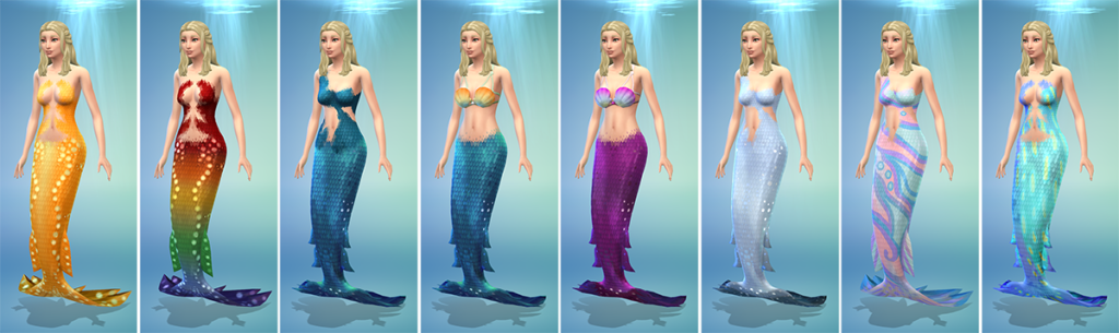 Самый простой вариант — создать русалку в CAS. В списке оккультных персонажей выберите русалку и начинайте творить. Как и для прочих сверхъестественных симов, для русалки можно настроить два облика — обычный и собственно облик русалки. Для этих целей в CAS добавлены специальные детали — различные варианты хвостов, специальные топы в виде чешуи, рыбацкой сети или морских ракушек, и даже особые виды глаз и набор акульих зубов!