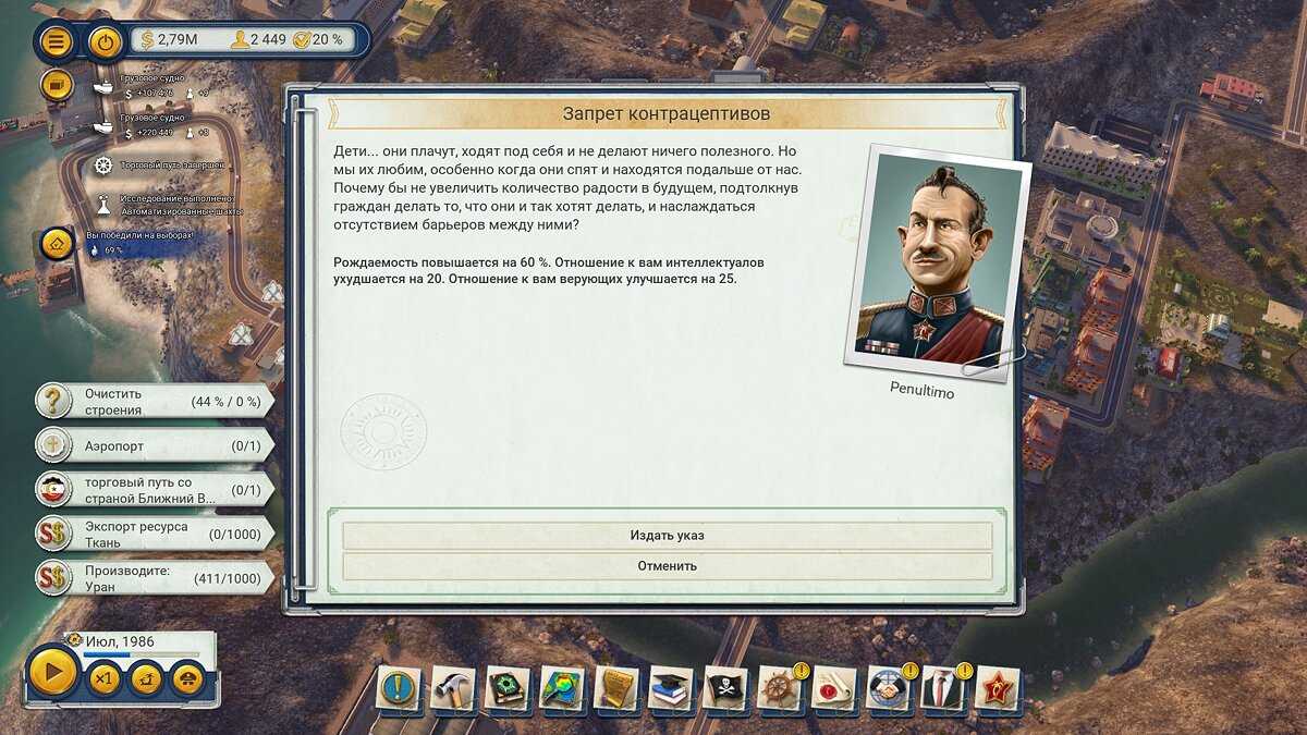 И, пожалуй — самое главное — отсутствие актуальной политической повестки. Вы не можете отыграть плохиша. Стать пожизненным, несменяемым диктатором, превратив жителей в крепостных рабов, должных государству до гроба.