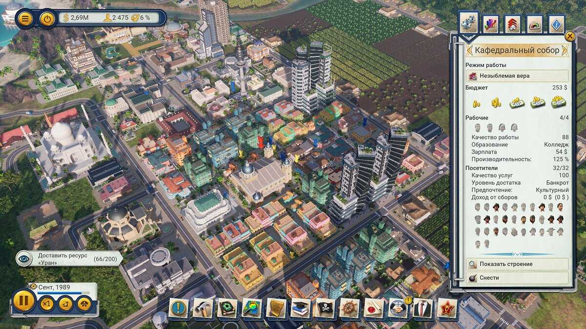 Или кафедральный собор — он принимает ограниченное число прихожан, но при этом подсвечивается как действующий в широкой области. Этим игра прямо вводит в заблуждение, поскольку при большой плотности жителей нужно строить несколько кафедральных соборов на одной и той же площади.