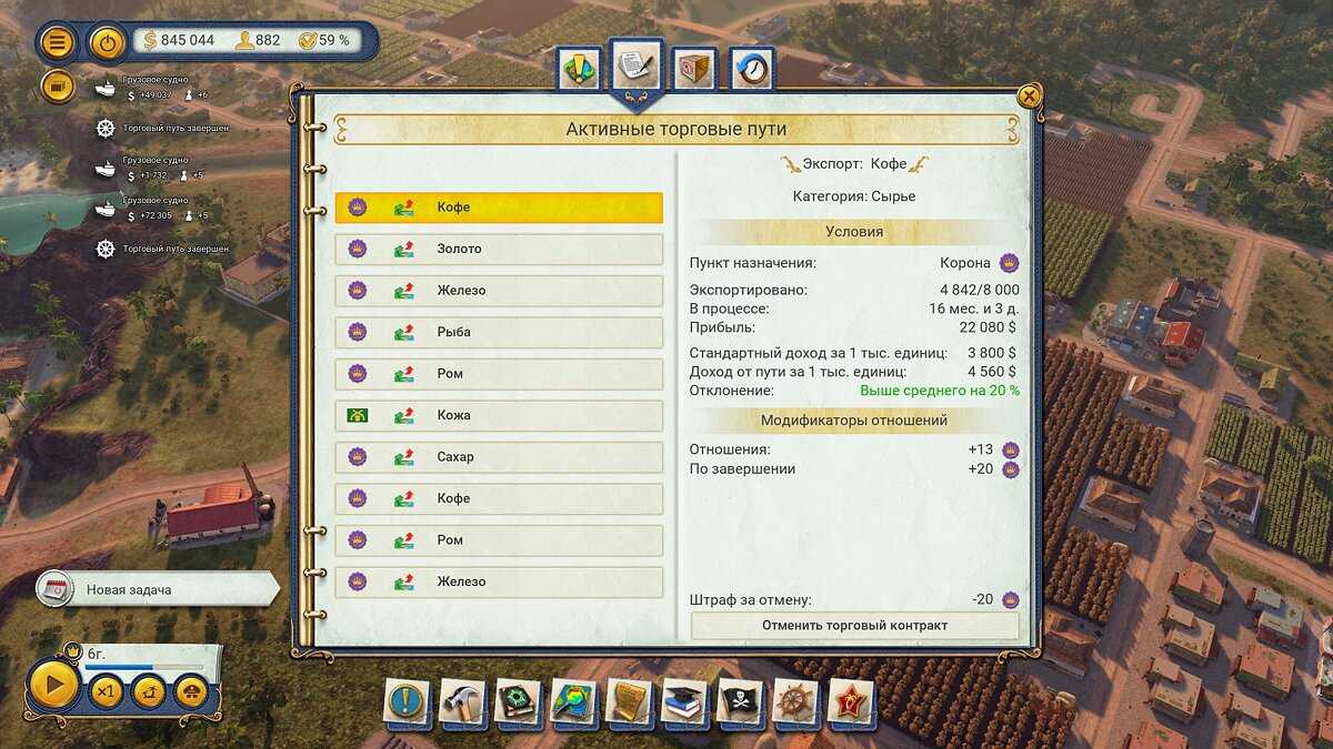 Вначале можно лишь торговать с метрополией, но в дальнейшем число держав увеличивается и между ними приходится балансировать, чтобы выжать максимум из внешней торговли.