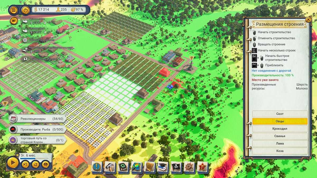 Как только вы убедите Короля в своей лояльности и разберетесь с основами экономики симулятора Тропико 5, то перед вами встанет следующая задача – добиться поддержки революционеров. Практически сразу, революционеры потребуют от вас построить библиотеку. Это единственное здание в колониальной эпохе способное создавать очки исследований. Они потребуются вам для того, чтобы получить улучшения для ранчо и плантаций, и в последующем, принять первую Конституцию. Конституция – это большое нововведение, которое отсутствовало в Tropico 4. Что касается поддержки революционеров, то время от времени они будут слать вам квесты. За выполненный квест вы можете получить на выбор одну из 3-х наград: прибытие 3-х образованных революционеров, один торговый путь для контрабандистов или 4000$. Выбирайте первый вариант, и в скором времени у вас на острове образуется целая революционная ячейка. Однако с одними революционерами далеко не уйдешь. Ведь все мы знаем, что бывает с теми, кто пытается сделать революцию без поддержки народа? Без него вам не завоевать независимость, так как для того чтобы отделиться от метрополии вам потребуется 50% поддержки. Для того, чтобы завоевать народную любовь, первым делом необходимо обеспечить население продовольствием. Лучше всего для этой цели подойдут кукурузные плантации, которые приносят 400 единиц продовольствия. За 2000$ вы можете улучшить свои плантации кукурузы, и они будут приносить еще больше продуктов. Конечно, кукуруза – это наиболее прибыльный вариант, однако вы бы хотели питаться каждый день одной кукурузой? Думаю, нет, также как и ваши тропиканцы. Поэтому, разнообразьте их рацион и постройте парочку ранчо и плантации с ананасами и бананами. Чтобы островитяне могли закупать продукты, постройте продуктовый магазин (1 на 150 человек). С указом о введении платы за продукты, эти продуктовые магазины (заменившие собой рынки из Тропико 4) смогут приносить вам небольшую, но стабильную прибыль. Также, стоит задуматься о постройке католической миссии (1 на 100 человек) и развлекательных зданий. При необходимости, можно принять указ о снижении налогов и предоставлении дополнительных продовольственных пайков. Если вы следовали вышеуказанным рекомендациям, то ваша экономика должна выдержа ть подобные нагрузки.