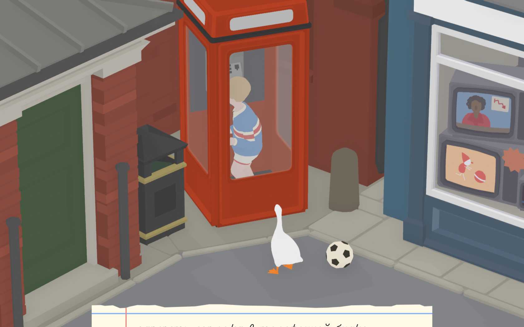 Trap the Boy in the phone boothThe Boy is terrified of geese, so follow him and keep honking to steer him into the phone booth at the top left of the area.