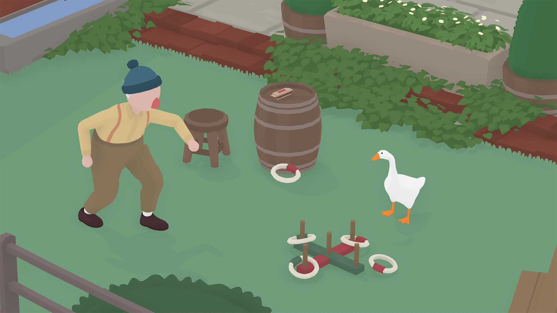 По геймплею Untitled Goose Game – это смесь квеста с головоломками на комбинацию предметов и действий, и stealth в духе Metal Gear Solid. На каждом из уровней, а это пять дворов и площадей той самой некогда тихой деревеньки, вам необходимо выполнить ряд простых на первый взгляд заданий. Украсть у жителей какой-то предмет, сломать определённую вещь, заманить кого-то из людей в ловушку. На самом деле это не так просто, как может показаться. Во-первых, люди, особенно вооружённые какими-нибудь граблями или шваброй, сильнее гуся и могут прогнать его. Во-вторых, заметив гуся с украденной вещью, они будут гнаться за вами, пока не отберут предмет. В-третьих, активных предметов на уровне масса и вы будете постоянно попадать в какие-то смешные и странные ситуации, но, увы, не в те, которые помогут вам с выполнением заданий. Ну и в-четвертых, некоторые задания требуют выполнения нескольких последовательных и порой не очевидных действий.