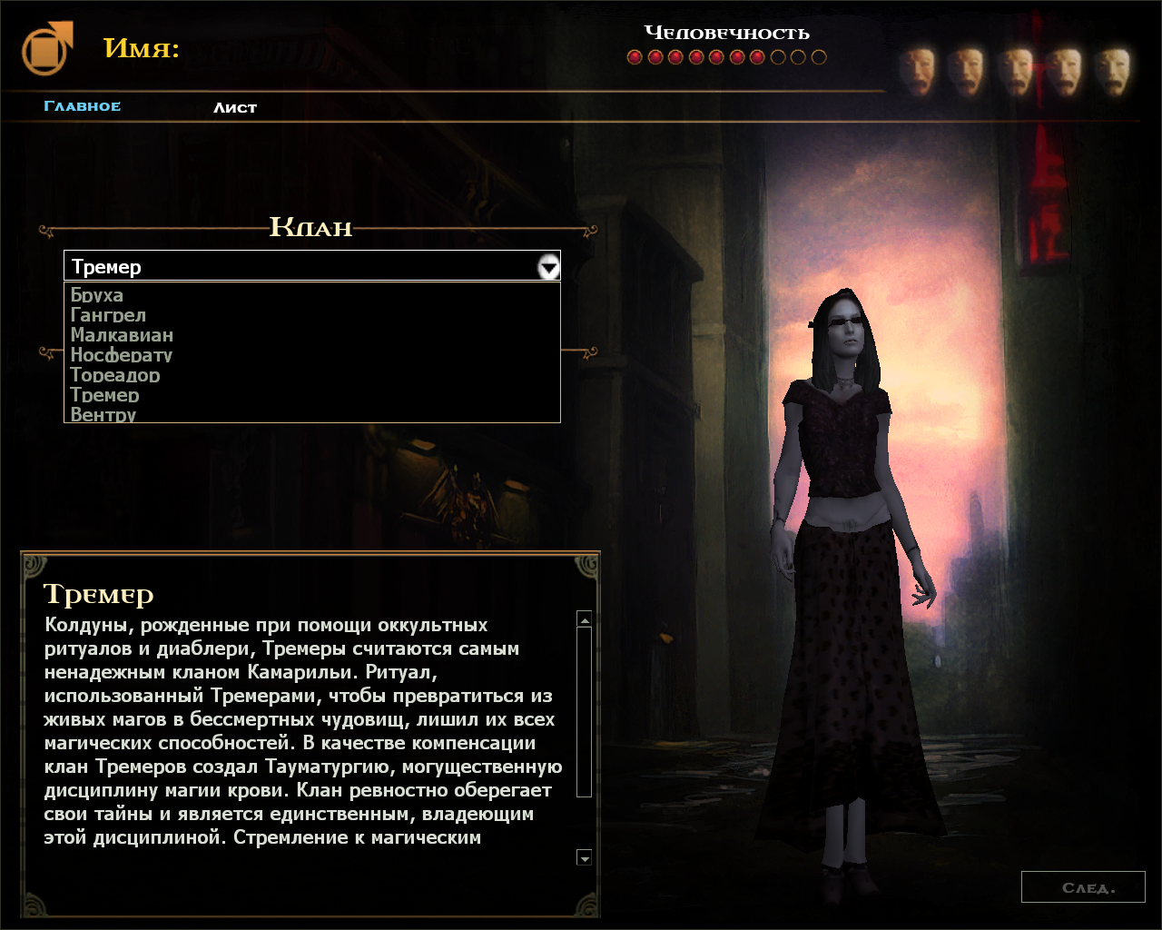 - Концепция: Одно или два слова, которые описывают, кем был ваш персонаж до Становления – например, сумасшедший линчеватель или порнозвезда.