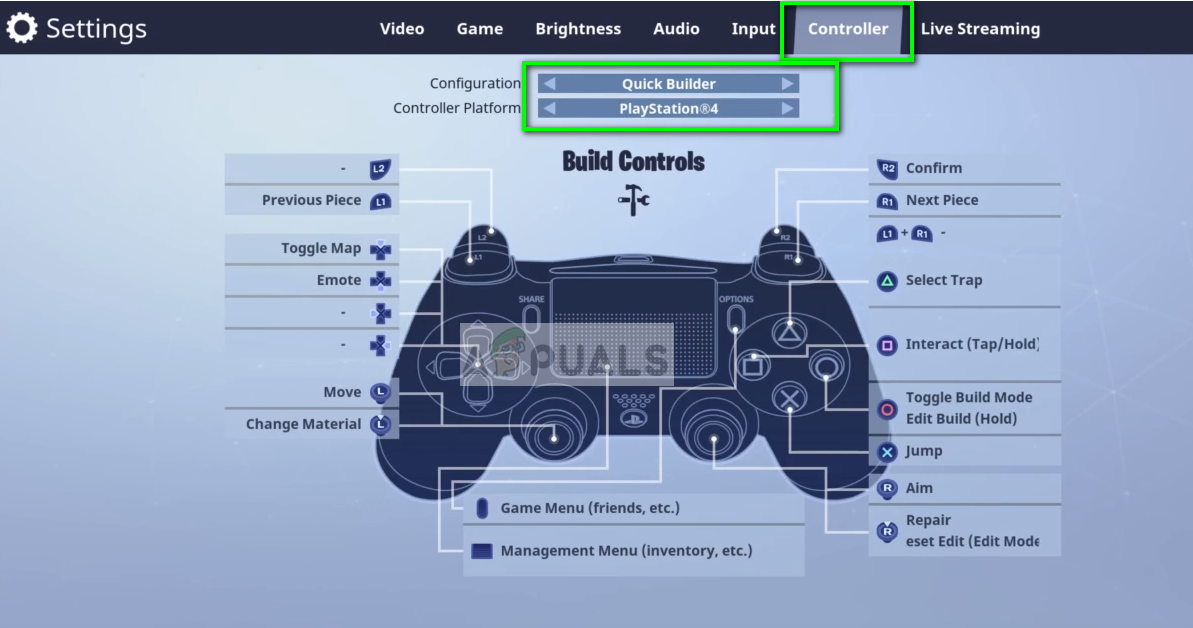 - Запуск Фортнит и перейти к настройкам. Теперь выберите контроллер и откройте его. Теперь выберите следующие опции: