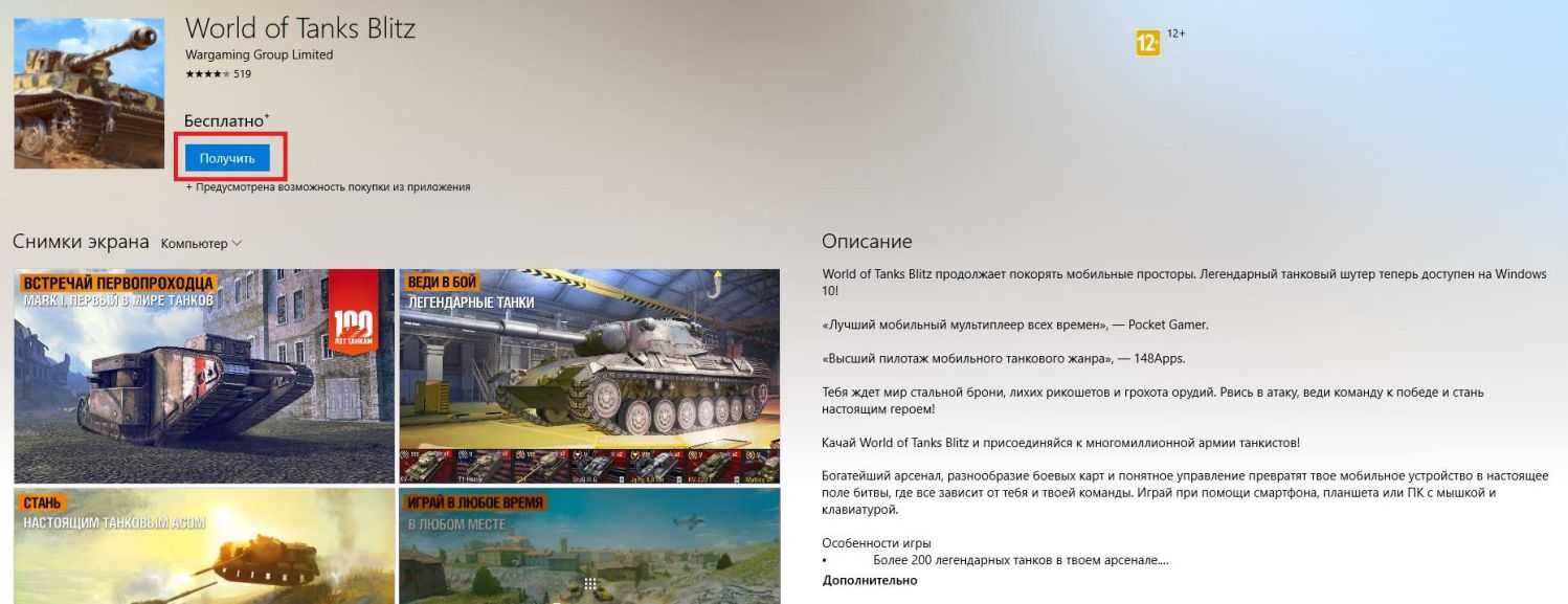 Выбрав приложение нажимаем «Получить» тем самым, пытаемся скачать world of tanks blitz на компьютер.