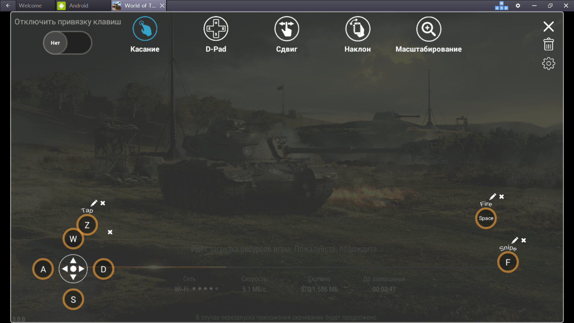 WASD отвечают за управление танком. Понажимай их и ты увидишь в левой части экрана изображение джойстика, а перед танком появится зелёная траектория движения и он начнёт перемещаться. Если вдруг управление движением “залипнет” (что случается нечасто) — попробуй нажать клавишу Z — она эмулирует тап по крестовине движения.