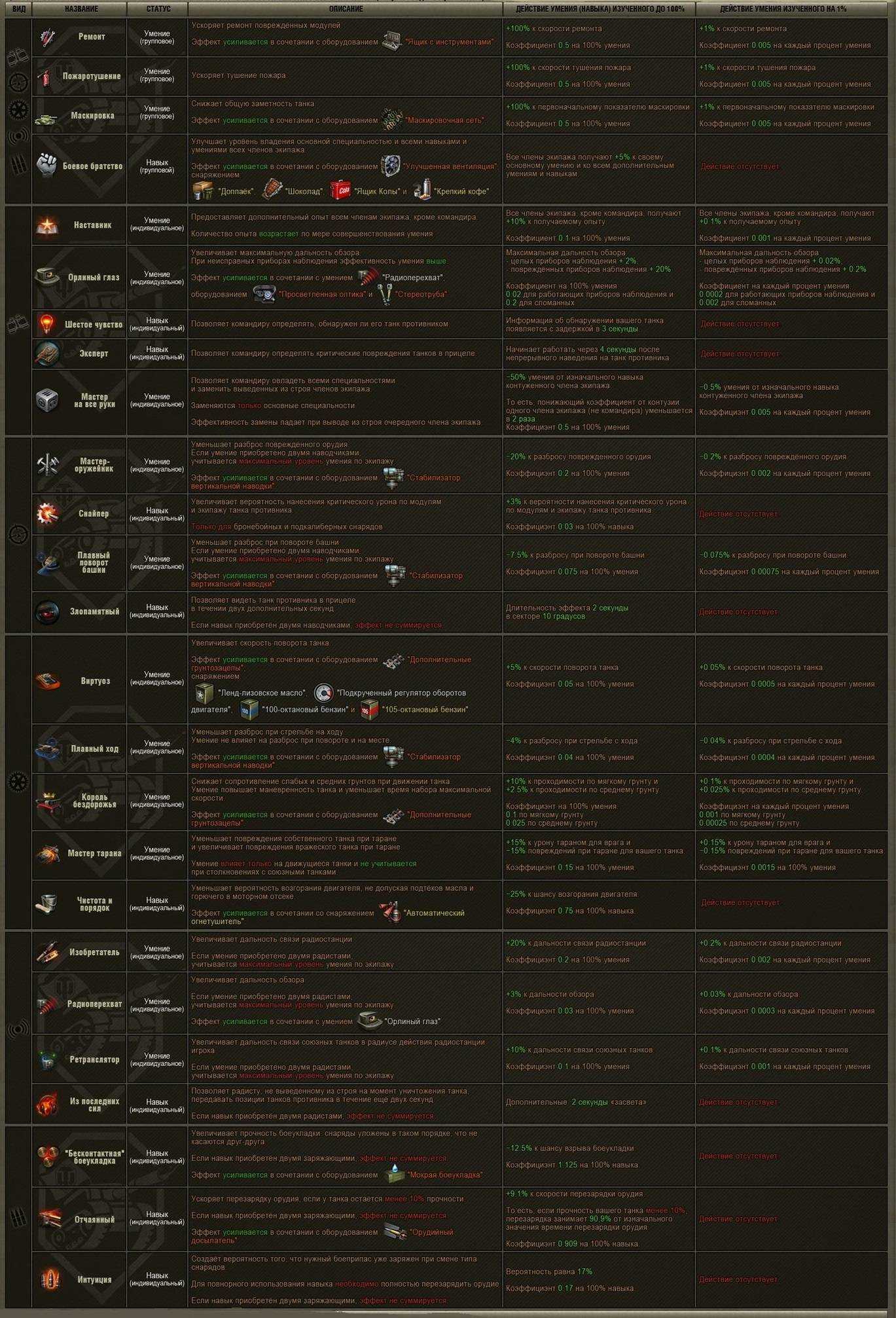 Навыки экипажа в World of Tanks не заканчиваются приведенным списком и на каждой отдельной машине они могут отличатся. Например, играя на Jagdpanzer E 100 не стоит тратить силы на прокачку маскировки, так как эта машина «светиться» даже с вкачанным этим навыком. Подробная таблица прокачки экипажа в World of Tanks приведена ниже.