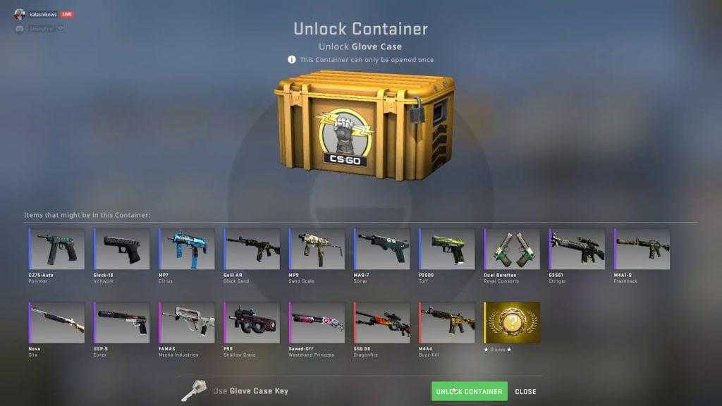 В большинстве случаев в кейсах есть шанс выбить скин ножа. Однако в перчаточном кейсе вместо ножа дропаются перчатки. Помимо небольшого шанса получить перчатки, в кейсе также есть скины для оружия в тропической тематике для одного из самых популярных видов оружия в игре.