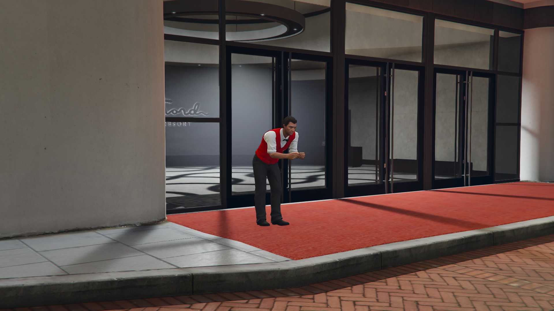 - Выдать себя за парковщика. Прибываем на точку и разбираемся с парковщиками. Если получили уровень розыска, то ждем, пока он спадет. Переодеваемся, забираем машины около входа в отель. Выполнив это задание, получаем униформу парковщика;
