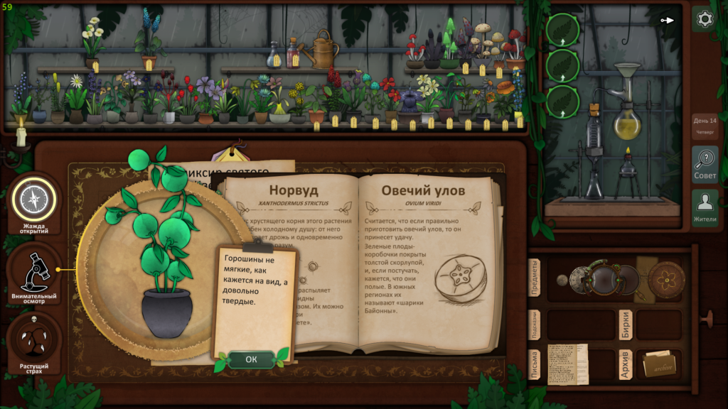 Положите ЛОМТЫ СТРАНИЦЫ на стол, переставьте их и поместите ГОРЯЧИЙ ЖЕЛЕЗ на них; переверните страницу и возьмите РЕЦЕПТ (K).Положите РЕЦЕПТ, ВАЛЕРИЙСКИЙ КОРЕНЬ, два ЦВЕТА, ДАРТ, ЭТАНОЛ и ЯД на стол.Поместите растения в ступку (1) и разотрите их. Поместите этанол (2) во флакон (3), откройте бутылку с ядом (4) и вылейте яд и порошок во флакон. Вращайте флакон, окуните дротик (5) во флакон и возьмите дротик с РЕВОЛЬВЕРОМ, чтобы получить РЕВОЛЬВЕР с АНТИДОТОМ (L).Идите вперед дважды.