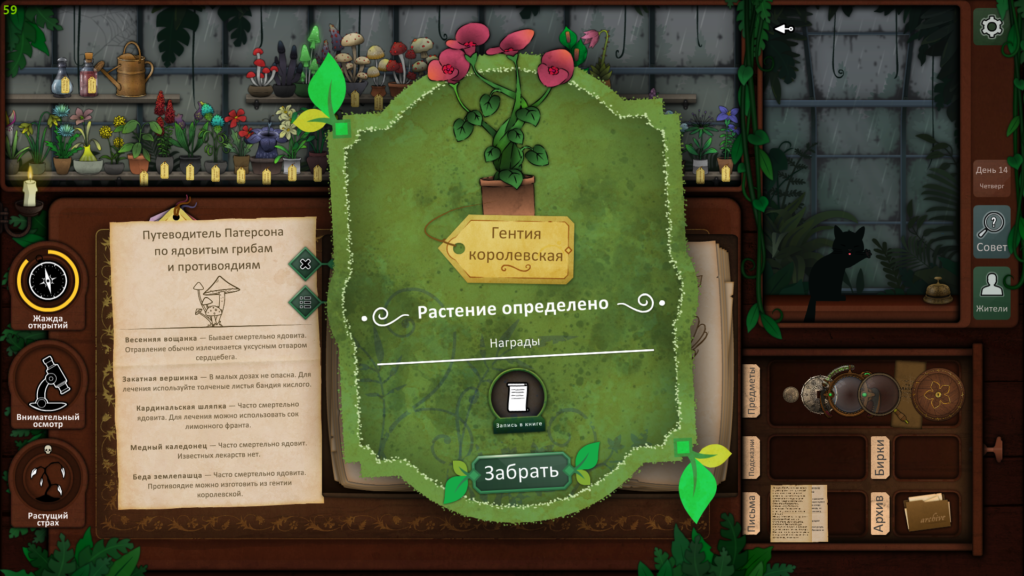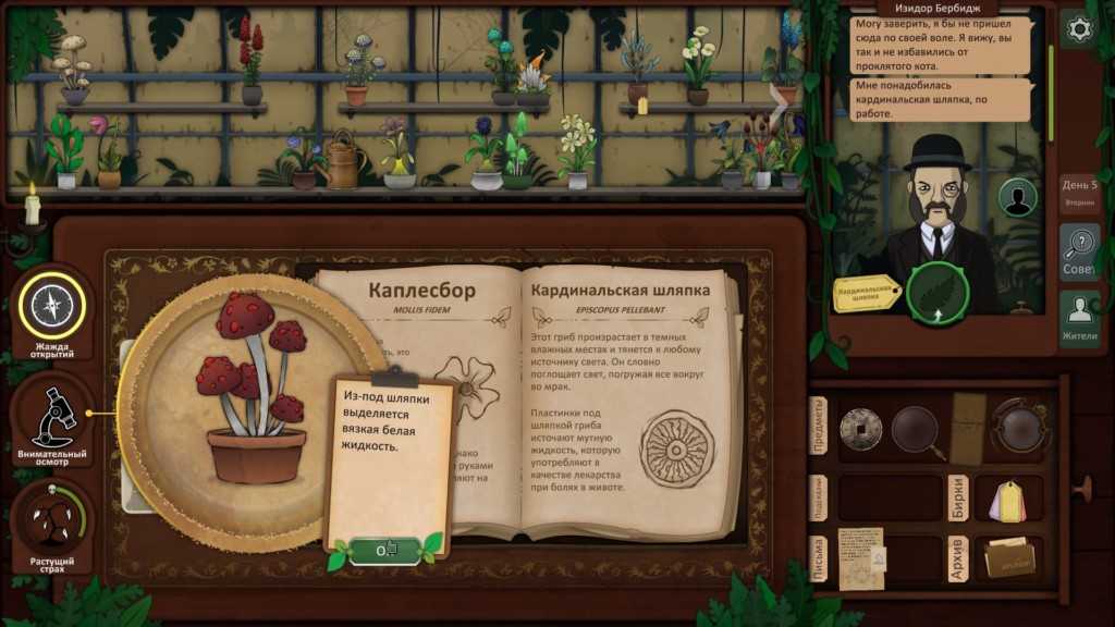 Вы можете определить гриб, который она дала вам вчера, как Беда землепашца, и, используя ваш путеводитель по грибам, вы можете увидеть, что Гентия королевская должна вылечить мужа.
