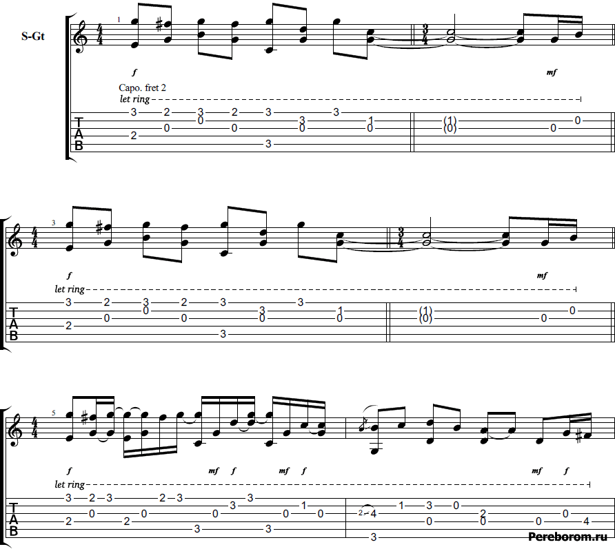 Как мы уже писали выше, для игры табулатур сложного варианта потребуется установить каподастр на втором ладу. Перед игрой обязательно проверьте настройку инструмента, это нужно для того чтобы мелодия звучала ровно на 1 тон выше, если ваша гитара не будет строить, то вы сразу заметите разнобой в звучании нот.