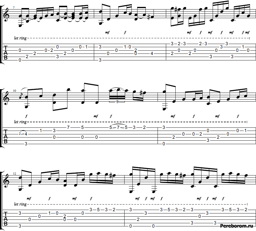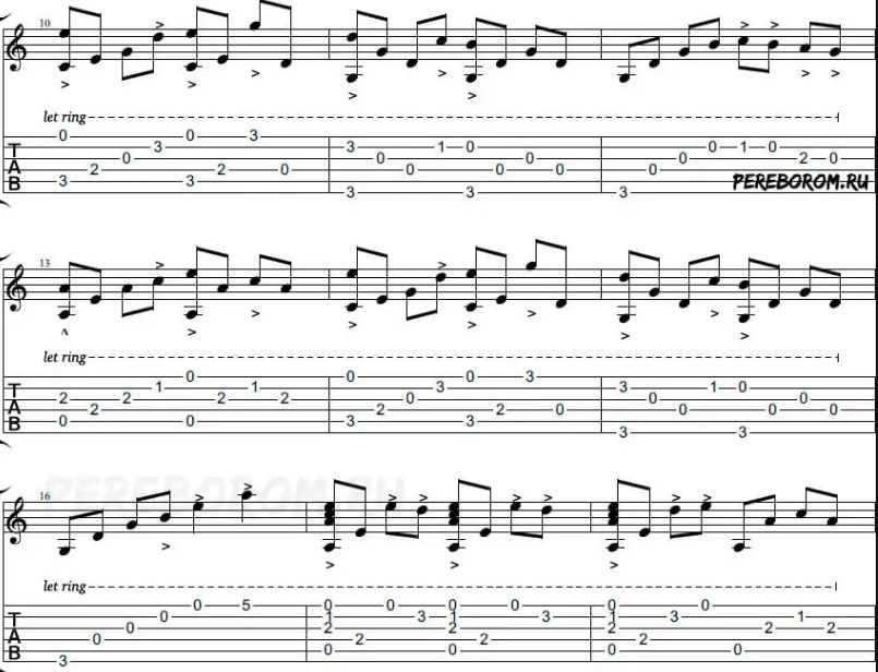 В момент зажатия струны на ладу, гитарист дергает ее на диафрагме, что создает определенный звук. Вот, например, табулатура перебором для песни Кино «Кукушка».