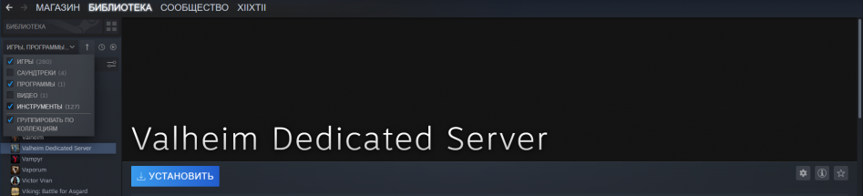 Включаем отображение содержимого вкладки «Инструменты», находим Valheim с Valheim Dedicated Server и устанавливаем их. Работать VDS будет, кстати, мимо Steam, всё-таки аккаунт нужен вам для запуска собственно игры, и не факт, что он будет происходить с одного и того же компьютера.