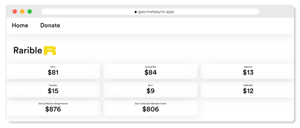 После того, как вы внесли все настройки, остается оплатить комиссию, чтобы продавать NFT на Rarible. Даже в течение дня она может меняться почти в два раза. Все зависит от загруженности блокчейна Эфириума. Сервис Gas Metasync в реальном времени отслеживает цены за разные действия. С его помощью можно сколько стоит выложить работу на Rarible и выбрать наиболее выгодное время для оплаты.